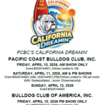 This is a friendly reminder that our Pacific Coast Bulldog Club (PCBC) specialty is just around the corner. Please don’t forget to make your entries! A special shout-out to all our juniors—your participation would be greatly appreciated, and it would be wonderful to see all of you there! **Important Dates:** – **Entries Close:** March 26,… Read more: Specialty Coming Up!
